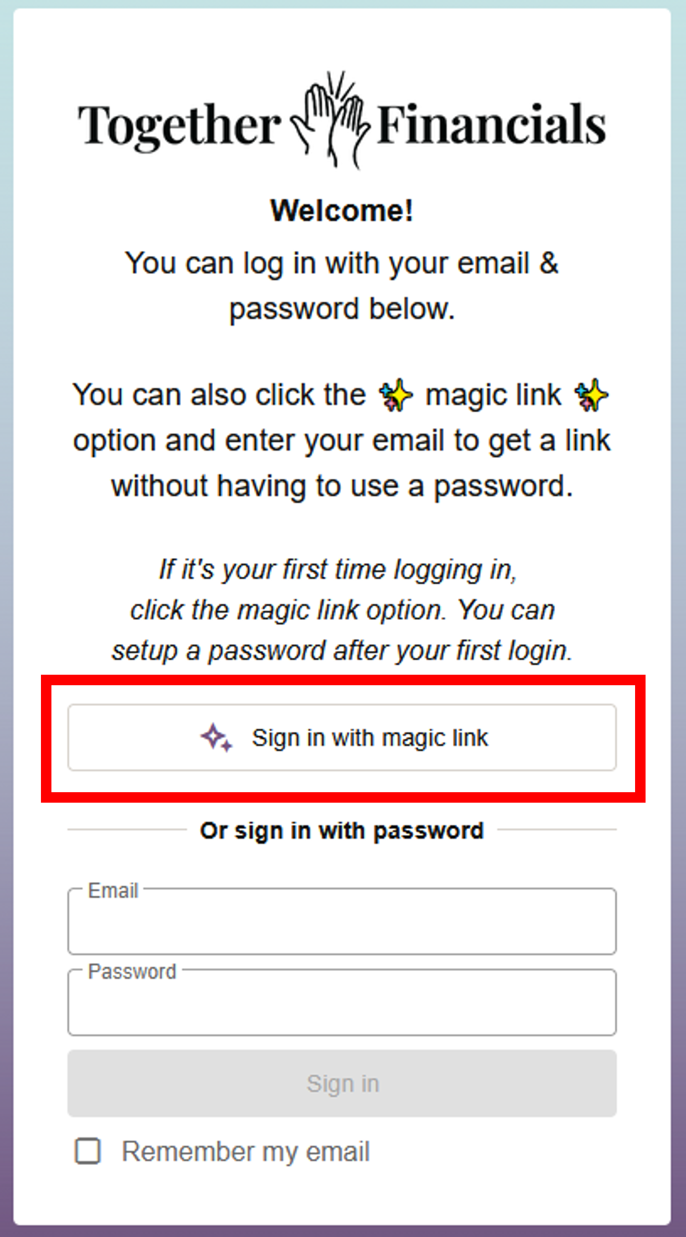 The first time you log in, you’ll use a magic link:
