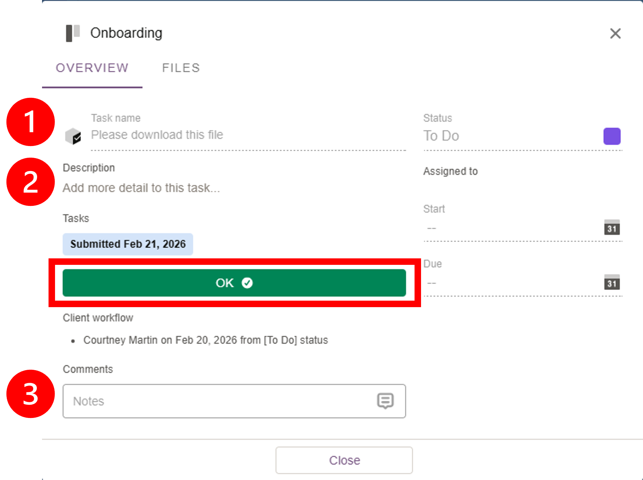 When you open a task, you’ll see several sections: