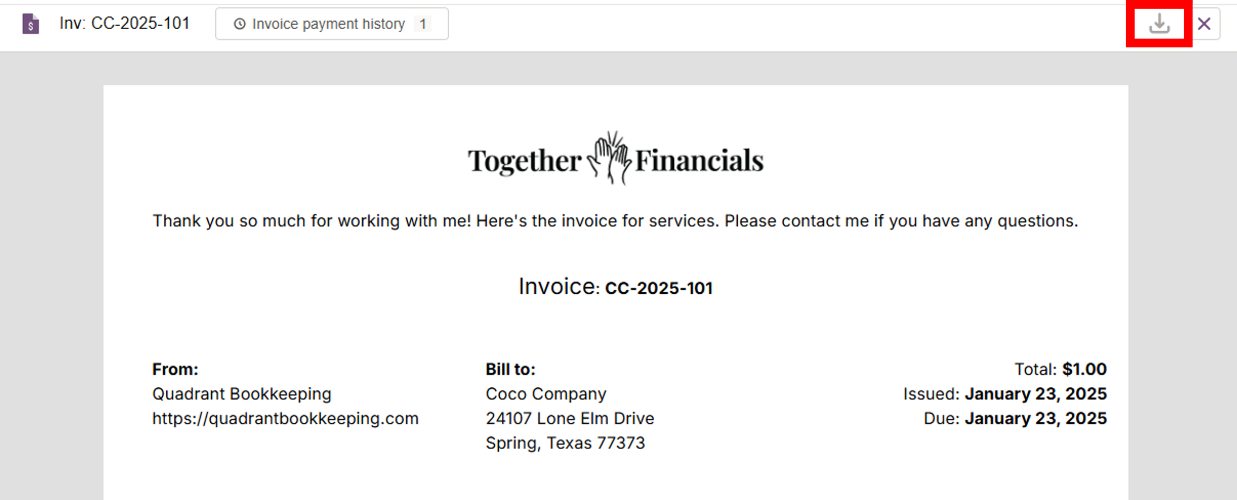 Click on an invoice to view it, and you can download it using the down arrow button in the top right corner.