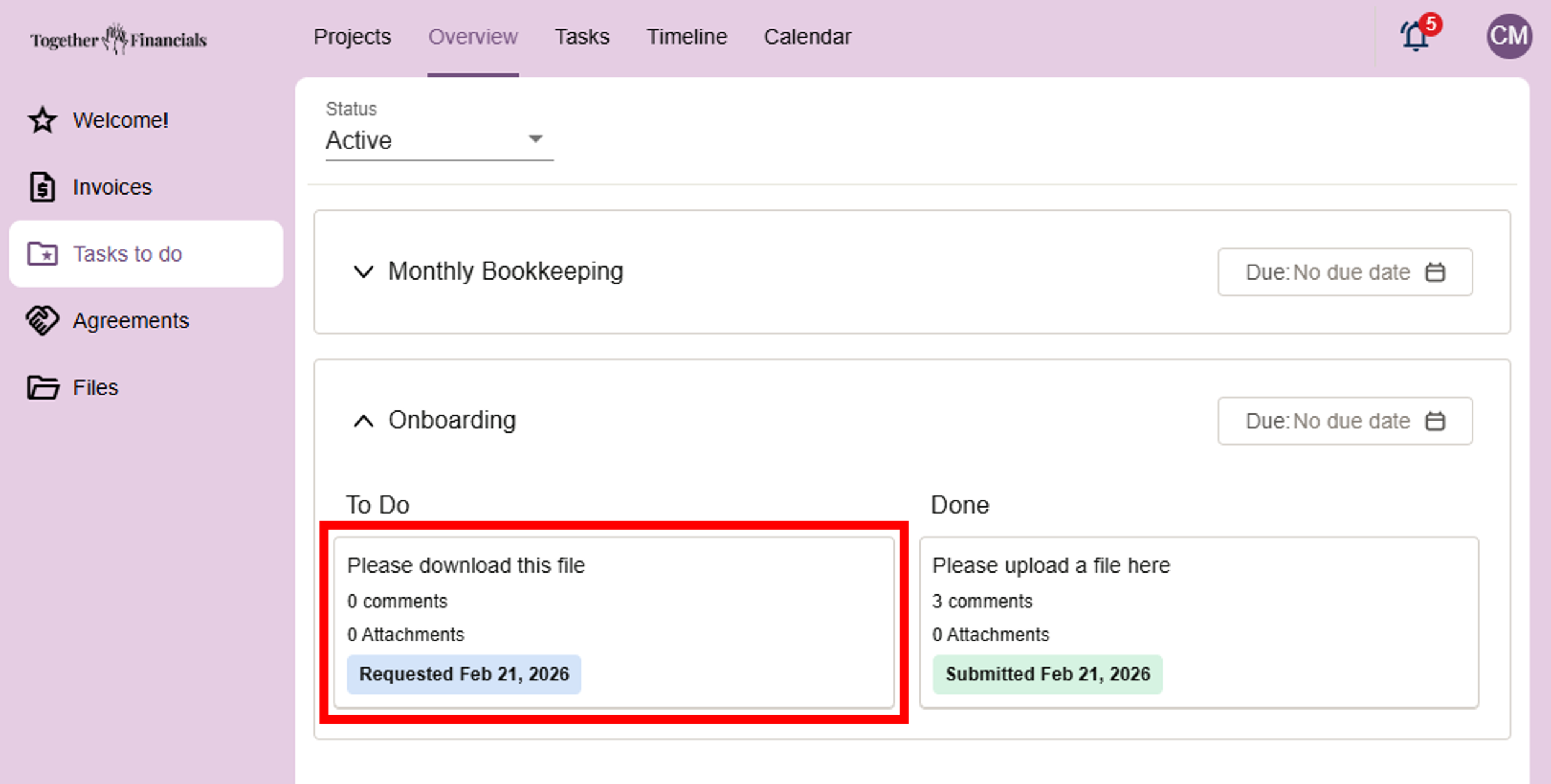 Your client portal is the central hub for everything related to our work together. This is where we’ll share documents, manage invoices, complete tasks, and keep communication clear and organized — without things getting lost in email.